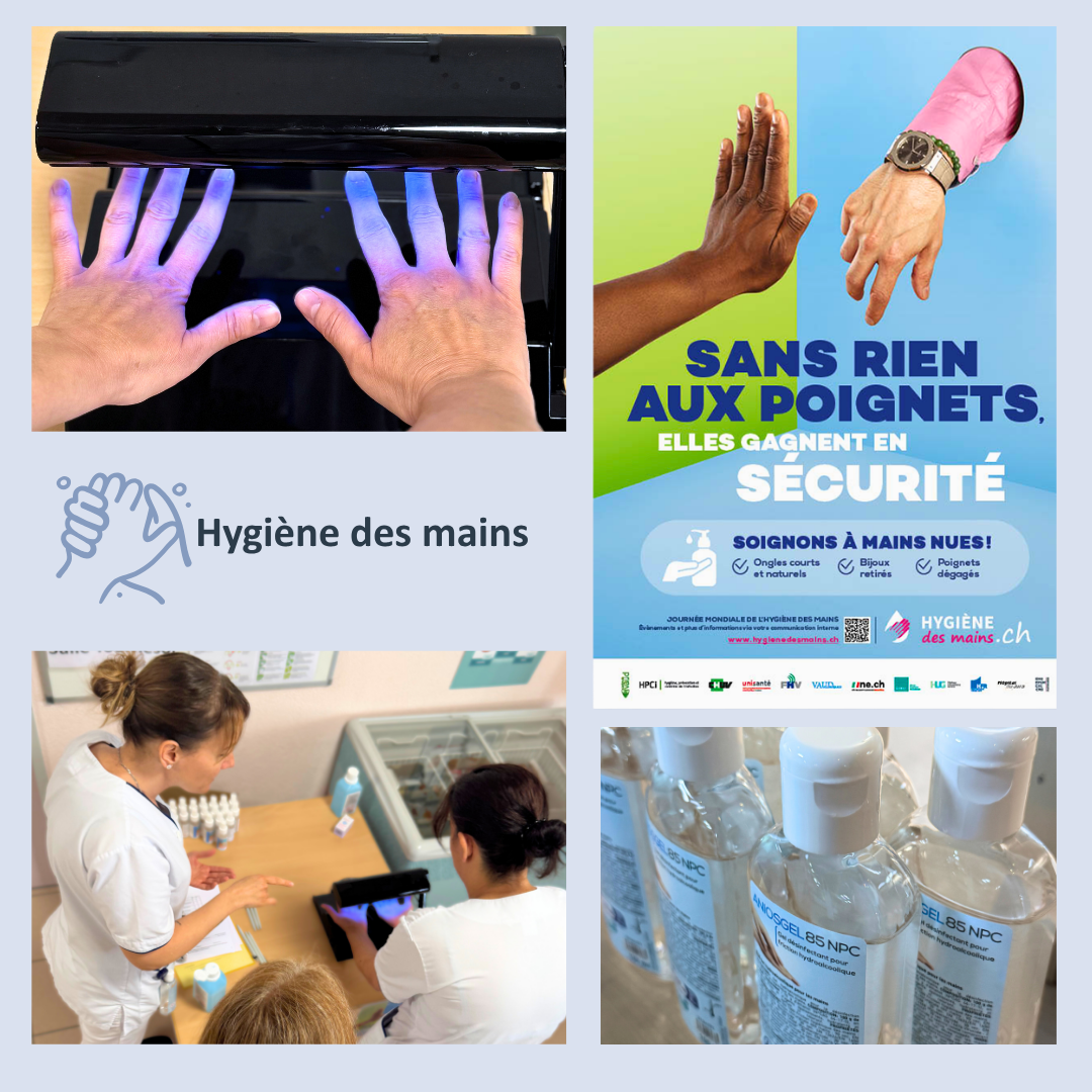Ce matin, notre clinicienne, Emily Pellaud, a sensibilisé tout le personnel à l'importance d’une bonne hygiène des mains. Grâce à un néon violet révélant les zones mal désinfectées, chacun a pu tester l’efficacité de son geste !