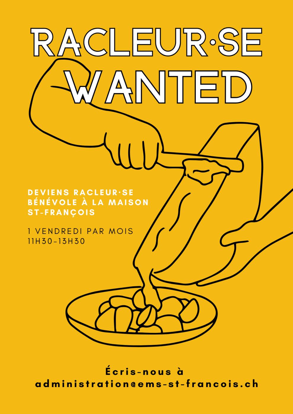 [lire la suite...]Aimerais-tu donner de ton temps en faveur des personnes âgées ? Nous cherchons un·e racleur·se prêt·e à s'engager dès à présent, pour compléter l'équipe des bénévoles, un vendredi par mois de 11h30 à 13h30. Pour t'inscrire ou pour obtenir plus d'informations, écris-nous à administration@ems-st-francois.ch.