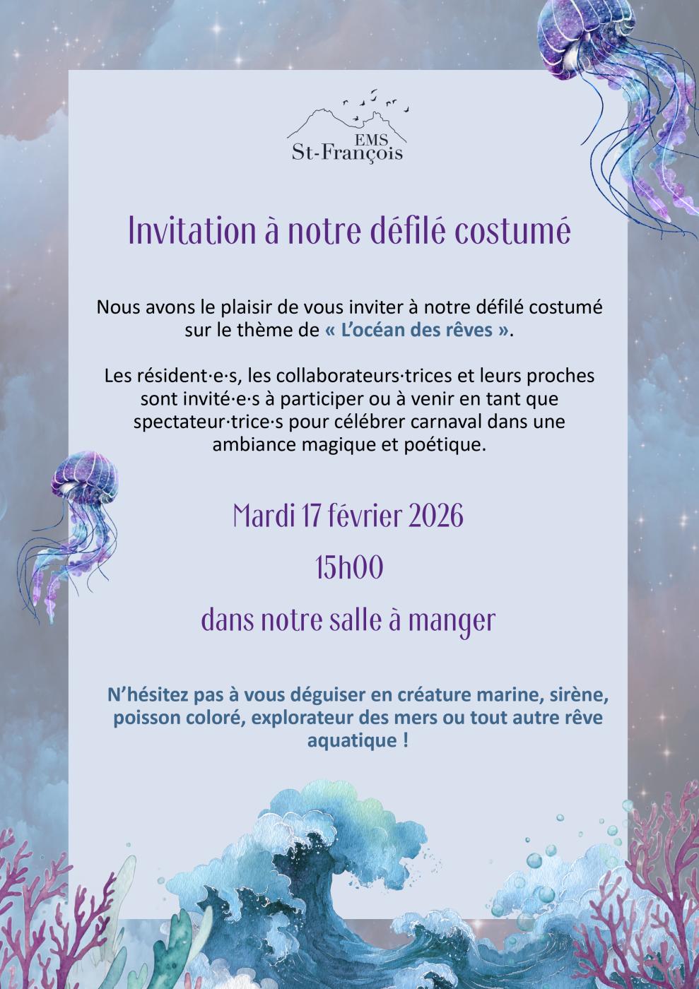 Nous avons le plaisir de vous inviter à partager un moment festif et poétique à l’occasion de notre défilé costumé de Carnaval, organisé à l’EMS St-François.